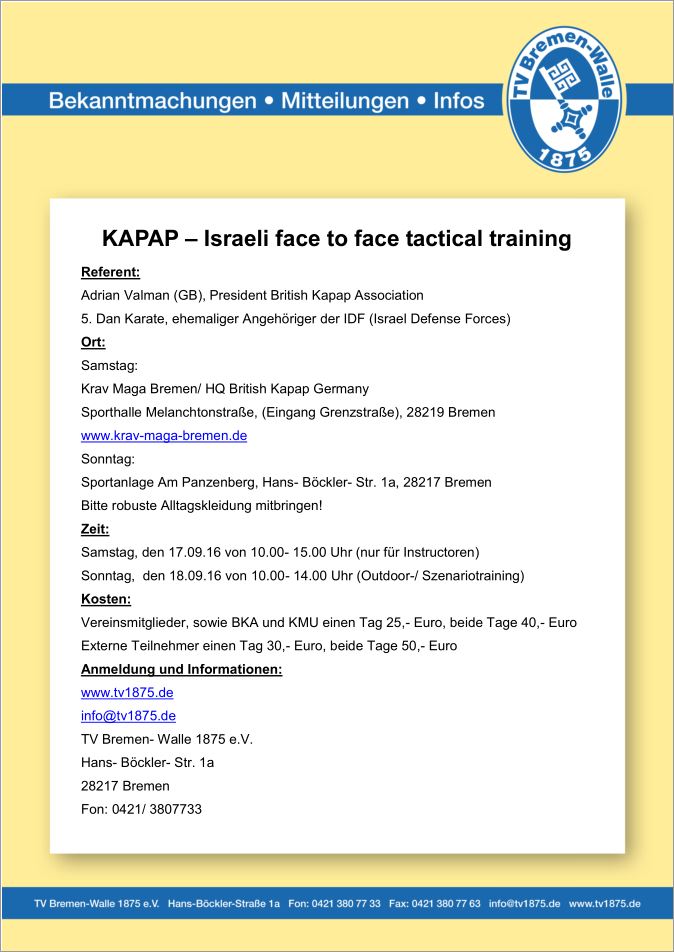 Am Samstag findet im Headquarter Germany der British KAPAP Association ein umfangreiches Update ausschließlich für Instructoren verschiedener Level der BKA statt.
