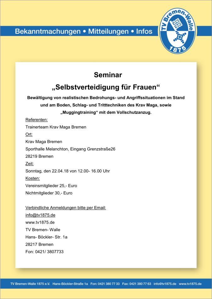 Im April findet "Selbstverteidigung für Frauen" statt. Anmeldungen sind ab jetzt möglich. Hier die Ausschreibung: